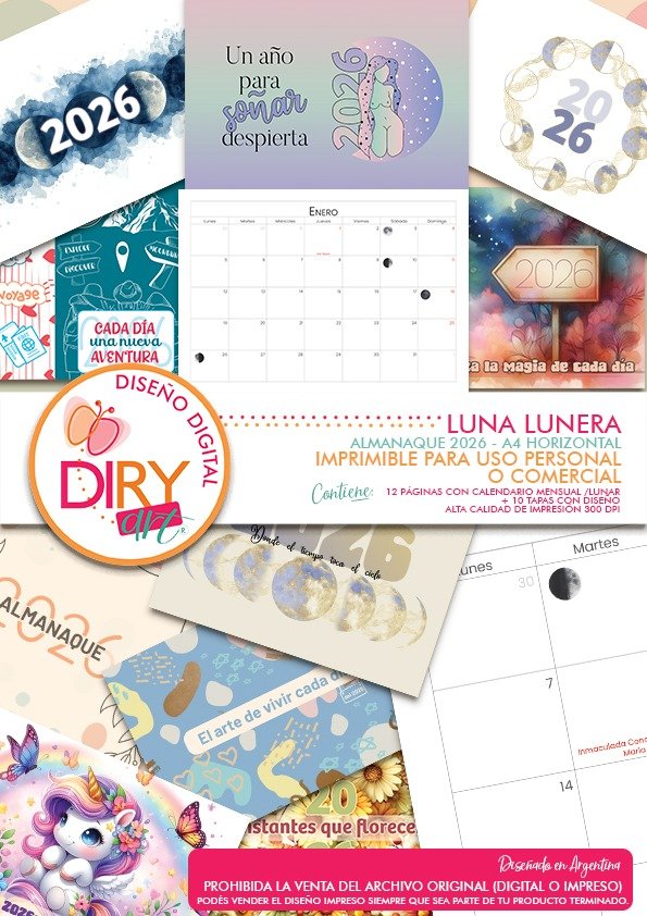 Contiene 12 planners A4 con el calendario 2026 lunar (Hemisferio Sur) y feriados nacionales.